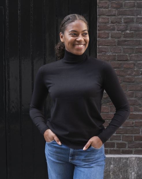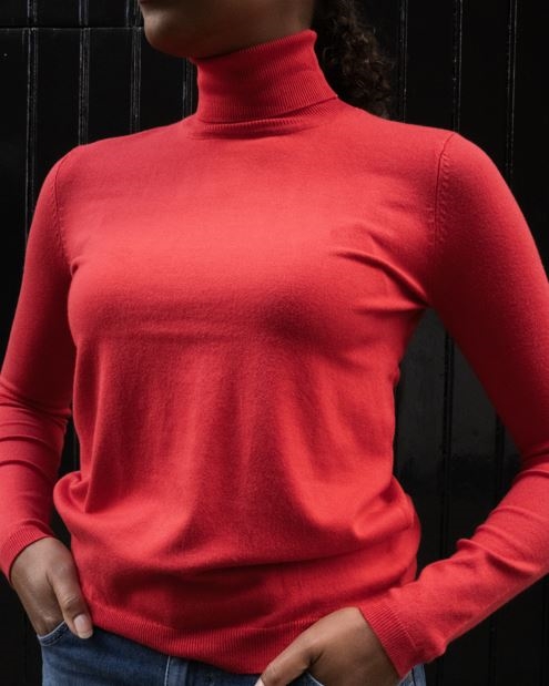Een fijn gebreide knit coltrui gecreëerd onder ons eigen label. De stof voelt zijde zacht aan. Nu nieuw in zwart, rood en grijs!